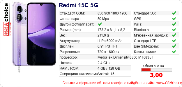 Данные о телефоне Redmi 15C 5G на Вашем сайте