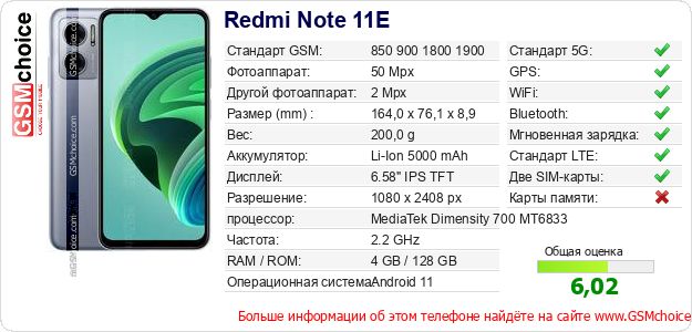 Данные о телефоне Redmi Note 11E на Вашем сайте