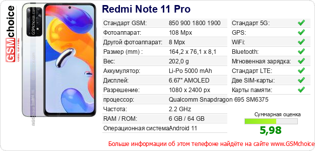 Данные о телефоне Redmi Note 11 Pro на Вашем сайте