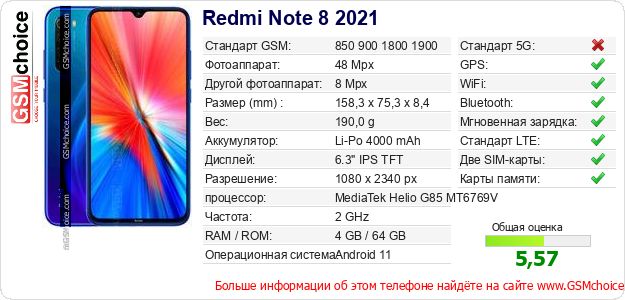 Данные о телефоне Redmi Note 8 2021 на Вашем сайте