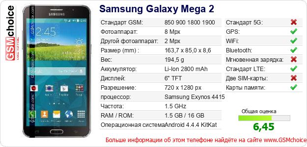 Данные о телефоне Samsung Galaxy Mega 2 на Вашем сайте