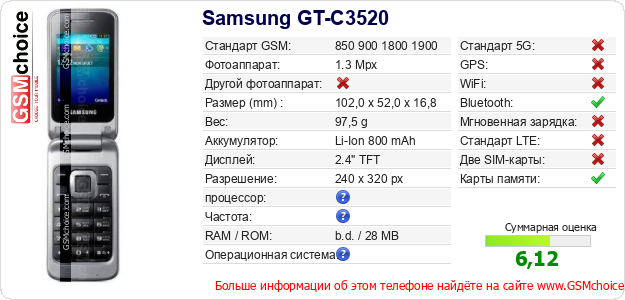 Данные о телефоне Samsung GT-C3520 на Вашем сайте