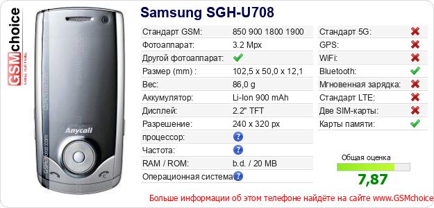 Данные о телефоне Samsung SGH-U708 на Вашем сайте
