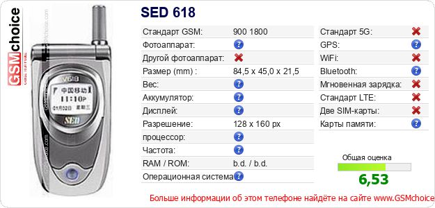 У Тебя есть свой сайт? Хочешь где-то разместить информацию о базовых данных мобильника SED 618 ? Это запросто устроить. Достаточно скачать картинку или скопировать и разместить на соответствующем сайте нижерасположенный код:Размещение этого кода вызовет появление нижерасположенной картинки: