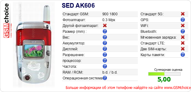 У Тебя есть свой сайт? Хочешь где-то разместить информацию о базовых данных мобильника SED AK606 ? Это запросто устроить. Достаточно скачать картинку или скопировать и разместить на соответствующем сайте нижерасположенный код:Размещение этого кода вызовет появление нижерасположенной картинки:
