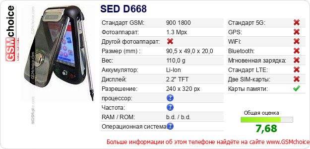 У Тебя есть свой сайт? Хочешь где-то разместить информацию о базовых данных мобильника SED D668 ? Это запросто устроить. Достаточно скачать картинку или скопировать и разместить на соответствующем сайте нижерасположенный код:Размещение этого кода вызовет появление нижерасположенной картинки: