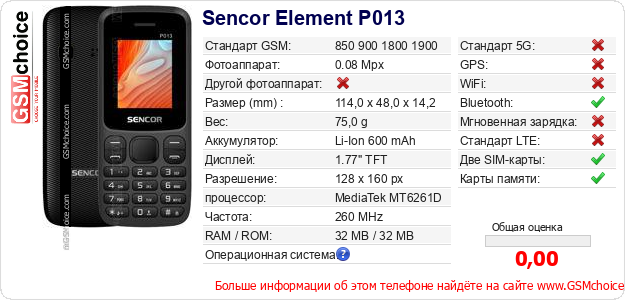 Данные о телефоне Sencor Element P013 на Вашем сайте