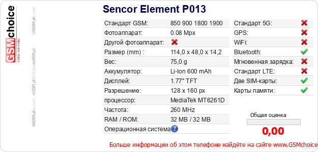 У Тебя есть свой сайт? Хочешь где-то разместить информацию о базовых данных мобильника Sencor Element P013 ? Это запросто устроить. Достаточно скачать картинку или скопировать и разместить на соответствующем сайте нижерасположенный код:Размещение этого кода вызовет появление нижерасположенной картинки:
