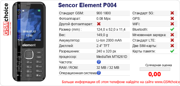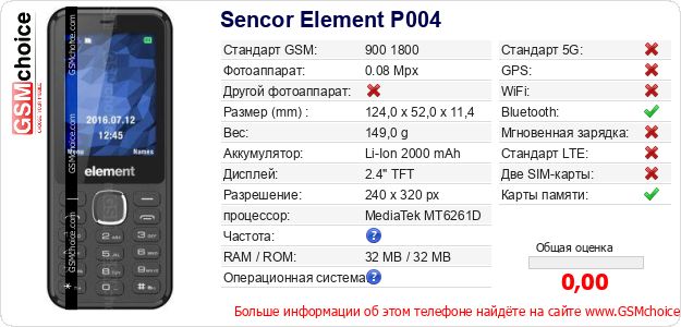 Данные о телефоне Sencor Element P004 на Вашем сайте