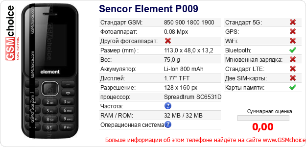 У Тебя есть свой сайт? Хочешь где-то разместить информацию о базовых данных мобильника Sencor Element P009 ? Это запросто устроить. Достаточно скачать картинку или скопировать и разместить на соответствующем сайте нижерасположенный код:Размещение этого кода вызовет появление нижерасположенной картинки: