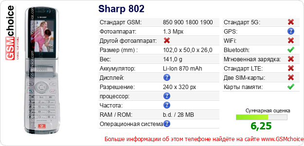 У Тебя есть свой сайт? Хочешь где-то разместить информацию о базовых данных мобильника Sharp 802 ? Это запросто устроить. Достаточно скачать картинку или скопировать и разместить на соответствующем сайте нижерасположенный код:Размещение этого кода вызовет появление нижерасположенной картинки: