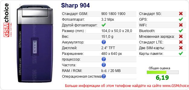 У Тебя есть свой сайт? Хочешь где-то разместить информацию о базовых данных мобильника Sharp 904 ? Это запросто устроить. Достаточно скачать картинку или скопировать и разместить на соответствующем сайте нижерасположенный код:Размещение этого кода вызовет появление нижерасположенной картинки: