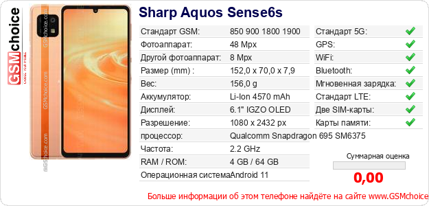 Данные о телефоне Sharp Aquos Sense6s на Вашем сайте