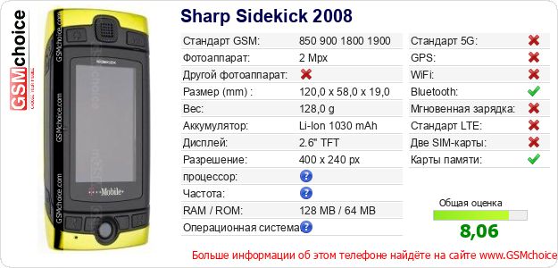 У Тебя есть свой сайт? Хочешь где-то разместить информацию о базовых данных мобильника Sharp Sidekick 2008 ? Это запросто устроить. Достаточно скачать картинку или скопировать и разместить на соответствующем сайте нижерасположенный код:Размещение этого кода вызовет появление нижерасположенной картинки: