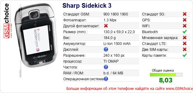 У Тебя есть свой сайт? Хочешь где-то разместить информацию о базовых данных мобильника Sharp Sidekick 3 ? Это запросто устроить. Достаточно скачать картинку или скопировать и разместить на соответствующем сайте нижерасположенный код:Размещение этого кода вызовет появление нижерасположенной картинки: