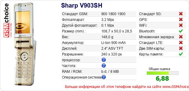 Данные о телефоне Sharp V903SH на Вашем сайте