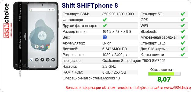 Данные о телефоне Shift SHIFTphone 8 на Вашем сайте