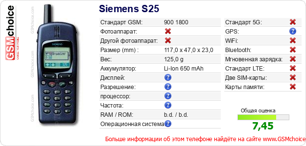 У Тебя есть свой сайт? Хочешь где-то разместить информацию о базовых данных мобильника Siemens S25 ? Это запросто устроить. Достаточно скачать картинку или скопировать и разместить на соответствующем сайте нижерасположенный код:Размещение этого кода вызовет появление нижерасположенной картинки: