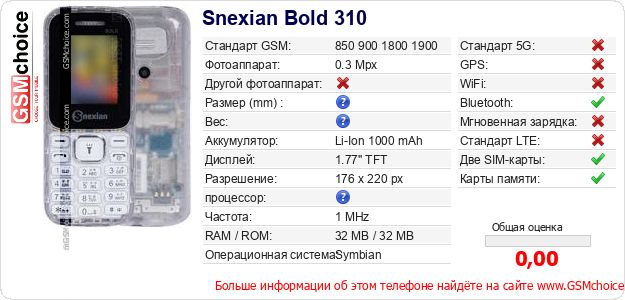Данные о телефоне Snexian Bold 310 на Вашем сайте