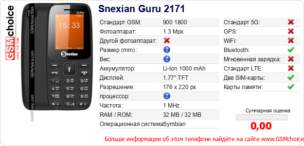 Данные о телефоне Snexian Guru 2171 на Вашем сайте