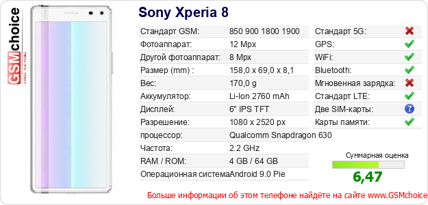 Данные о телефоне Sony Xperia 8 на Вашем сайте