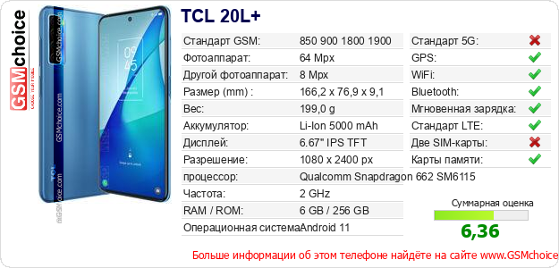 Данные о телефоне TCL 20L+ на Вашем сайте