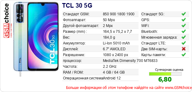 Данные о телефоне TCL 30 5G на Вашем сайте