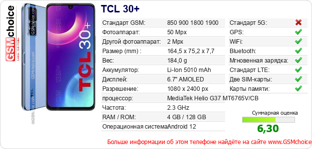 У Тебя есть свой сайт? Хочешь где-то разместить информацию о базовых данных мобильника TCL 30+ ? Это запросто устроить. Достаточно скачать картинку или скопировать и разместить на соответствующем сайте нижерасположенный код:Размещение этого кода вызовет появление нижерасположенной картинки: