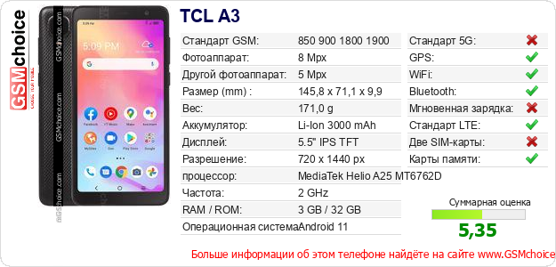 У Тебя есть свой сайт? Хочешь где-то разместить информацию о базовых данных мобильника TCL A3 ? Это запросто устроить. Достаточно скачать картинку или скопировать и разместить на соответствующем сайте нижерасположенный код:Размещение этого кода вызовет появление нижерасположенной картинки:
