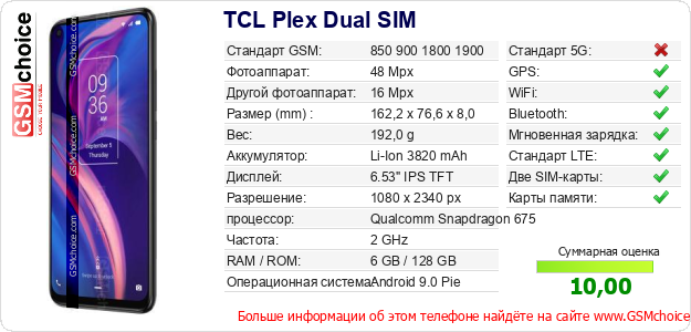 Данные о телефоне TCL Plex Dual SIM на Вашем сайте