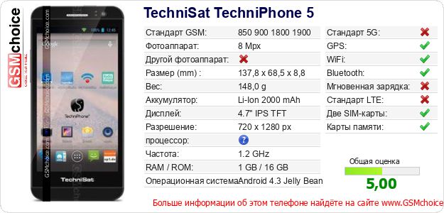 У Тебя есть свой сайт? Хочешь где-то разместить информацию о базовых данных мобильника TechniSat TechniPhone 5 ? Это запросто устроить. Достаточно скачать картинку или скопировать и разместить на соответствующем сайте нижерасположенный код:Размещение этого кода вызовет появление нижерасположенной картинки:
