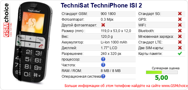 У Тебя есть свой сайт? Хочешь где-то разместить информацию о базовых данных мобильника TechniSat TechniPhone ISI 2 ? Это запросто устроить. Достаточно скачать картинку или скопировать и разместить на соответствующем сайте нижерасположенный код:Размещение этого кода вызовет появление нижерасположенной картинки: