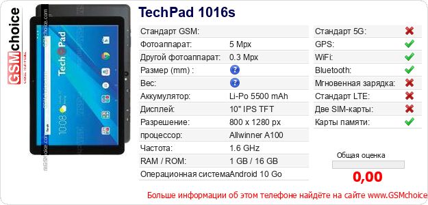 Данные о телефоне TechPad 1016s на Вашем сайте