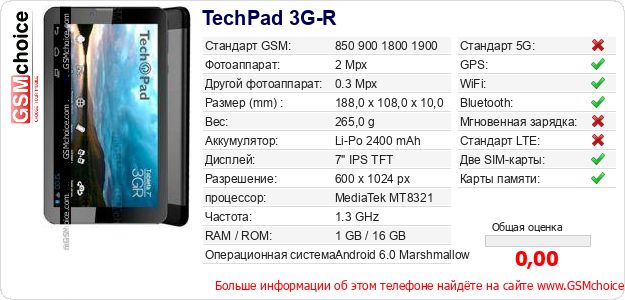 Данные о телефоне TechPad 3G-R на Вашем сайте