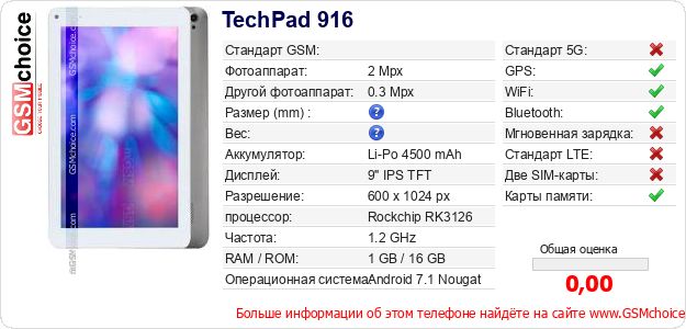 Данные о телефоне TechPad 916 на Вашем сайте