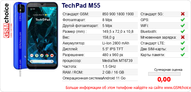 У Тебя есть свой сайт? Хочешь где-то разместить информацию о базовых данных мобильника TechPad M55 ? Это запросто устроить. Достаточно скачать картинку или скопировать и разместить на соответствующем сайте нижерасположенный код:Размещение этого кода вызовет появление нижерасположенной картинки:
