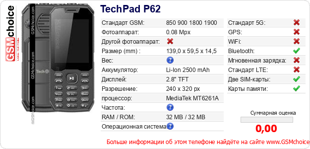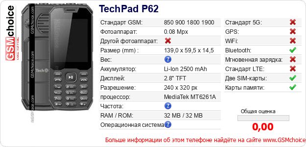 У Тебя есть свой сайт? Хочешь где-то разместить информацию о базовых данных мобильника TechPad P62 ? Это запросто устроить. Достаточно скачать картинку или скопировать и разместить на соответствующем сайте нижерасположенный код:Размещение этого кода вызовет появление нижерасположенной картинки: