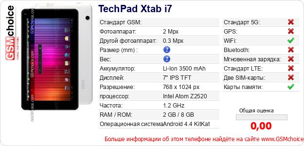 Данные о телефоне TechPad Xtab i7 на Вашем сайте