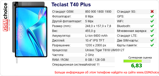 Данные о телефоне Teclast T40 Plus на Вашем сайте