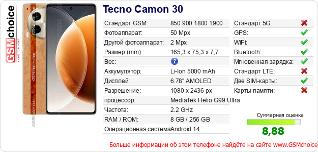 Данные о телефоне Tecno Camon 30 на Вашем сайте