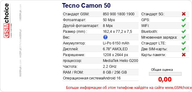 Данные о телефоне Tecno Camon 50 на Вашем сайте