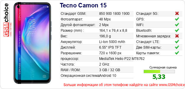 Данные о телефоне Tecno Camon 15 на Вашем сайте