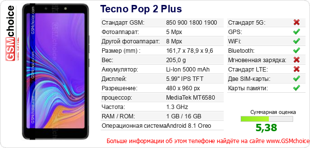 Данные о телефоне Tecno Pop 2 Plus на Вашем сайте