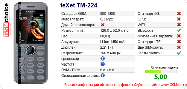 Данные о телефоне teXet TM-224 на Вашем сайте