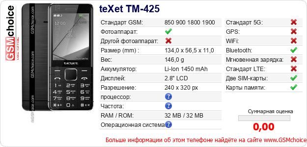 Данные о телефоне teXet TM-425 на Вашем сайте