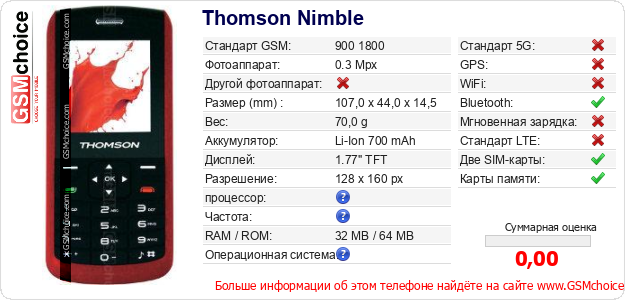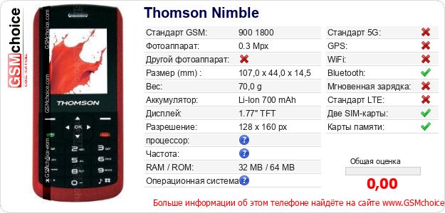 Данные о телефоне Thomson Nimble на Вашем сайте