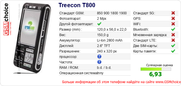 У Тебя есть свой сайт? Хочешь где-то разместить информацию о базовых данных мобильника Treecon T800 ? Это запросто устроить. Достаточно скачать картинку или скопировать и разместить на соответствующем сайте нижерасположенный код:Размещение этого кода вызовет появление нижерасположенной картинки: