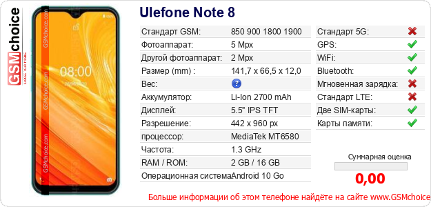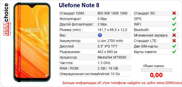 Данные о телефоне Ulefone Note 8 на Вашем сайте