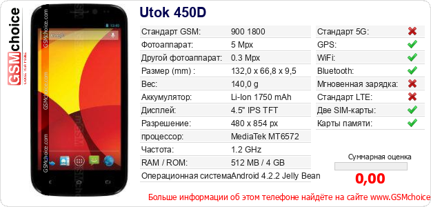 У Тебя есть свой сайт? Хочешь где-то разместить информацию о базовых данных мобильника Utok 450D ? Это запросто устроить. Достаточно скачать картинку или скопировать и разместить на соответствующем сайте нижерасположенный код:Размещение этого кода вызовет появление нижерасположенной картинки: