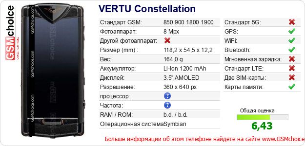 У Тебя есть свой сайт? Хочешь где-то разместить информацию о базовых данных мобильника VERTU Constellation ? Это запросто устроить. Достаточно скачать картинку или скопировать и разместить на соответствующем сайте нижерасположенный код:Размещение этого кода вызовет появление нижерасположенной картинки: